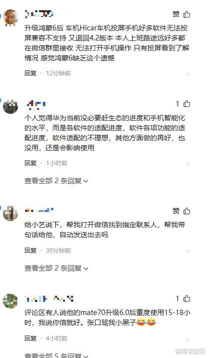 与官方热情宣传形成鲜明对比的是,网络上的用户评价呈现明显的两极分化。在相关新闻的评论区,有用户直接吐槽:升级到鸿蒙6不好用。还有用户表示:华为没必要为了赶生态进度,因此赶各种软件的适配进度。更有表达不满:我只是提出疑问,就有人说我是黑子。